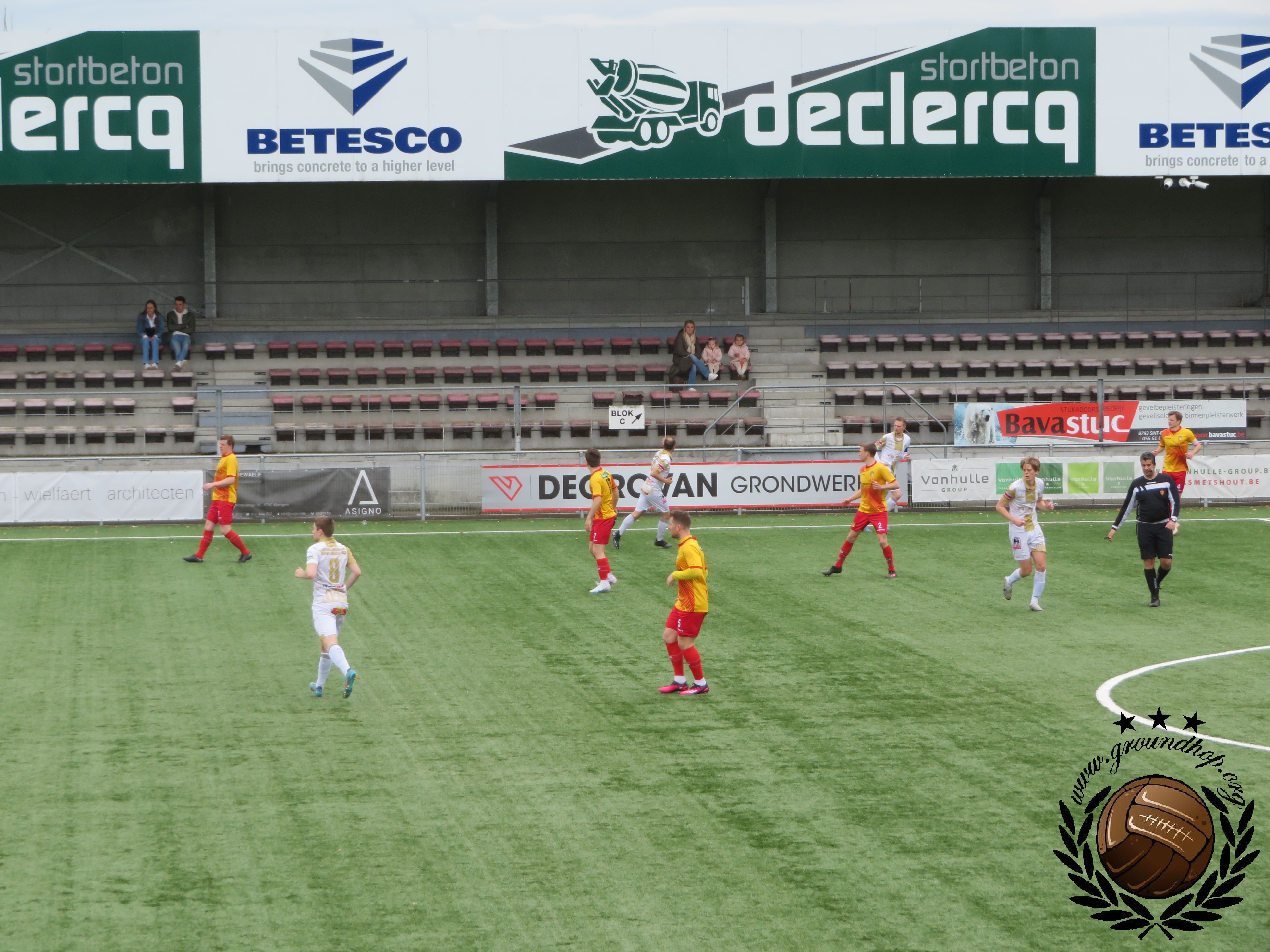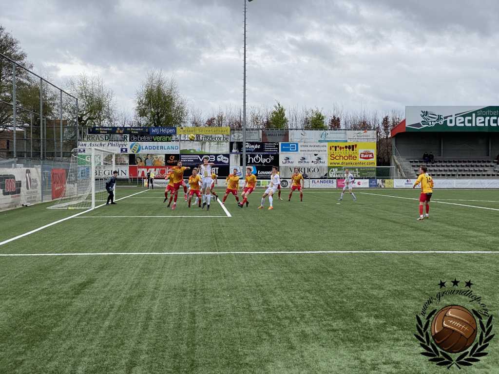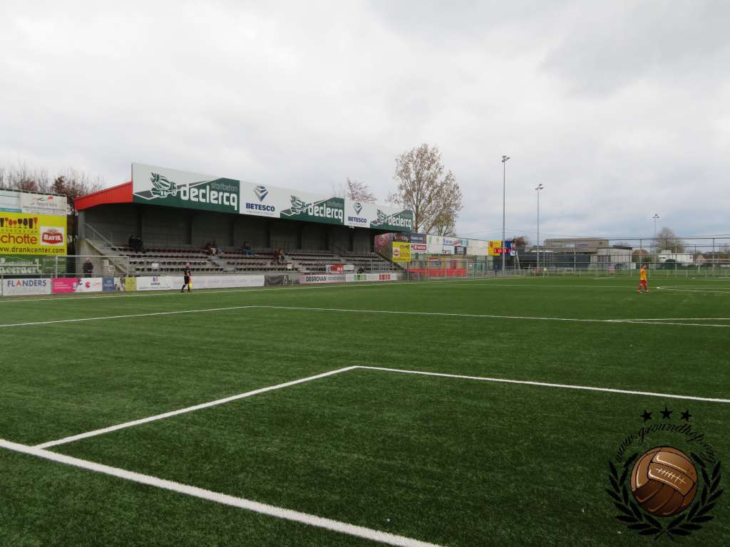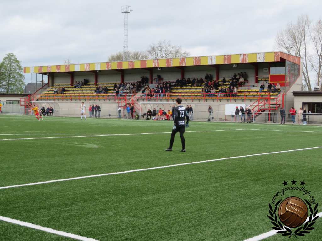 Inmiddels posteren wij onszelf aan de andere kant van het veld, zodat we zekerheid hebben dat we alles van het Mirakelstadion goed op de foto hebben staan. Nadat we dit eenmaal hebben afgerond lopen we weer terug naar iets overdekts en terwijl wij dit doen valt het langverwachte eerste doelpunt. Het is een voorzet die van dichtbij wordt binnengekopt waarop de doelman van Waregem moet capituleren en zo staat Diksmuide op voorsprong.