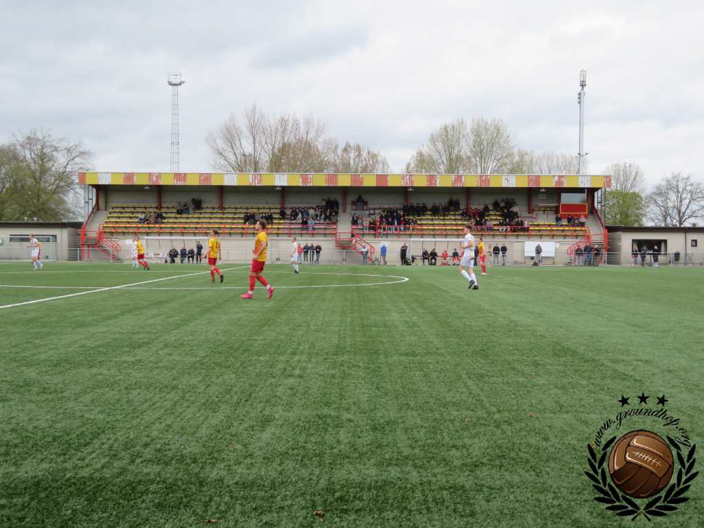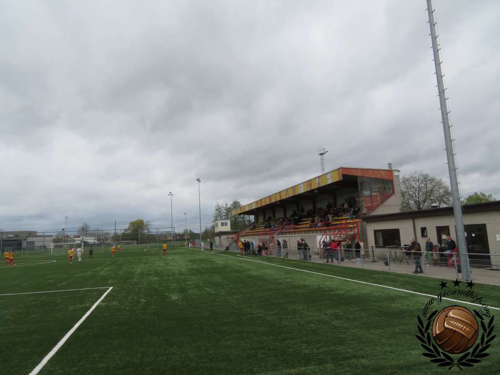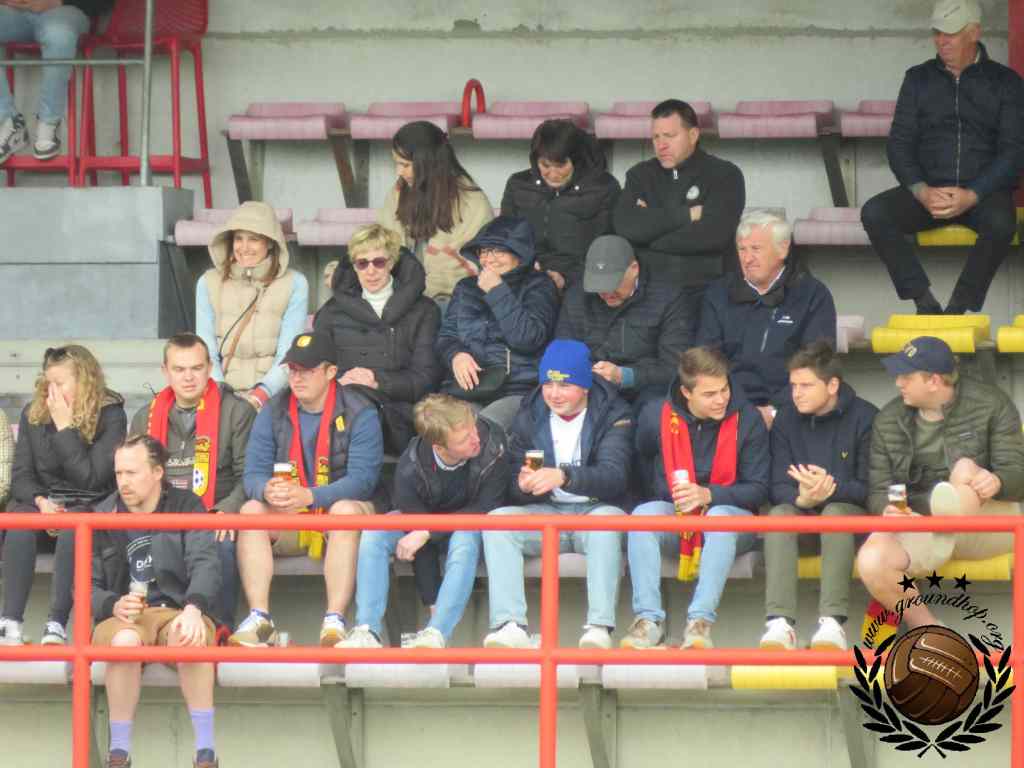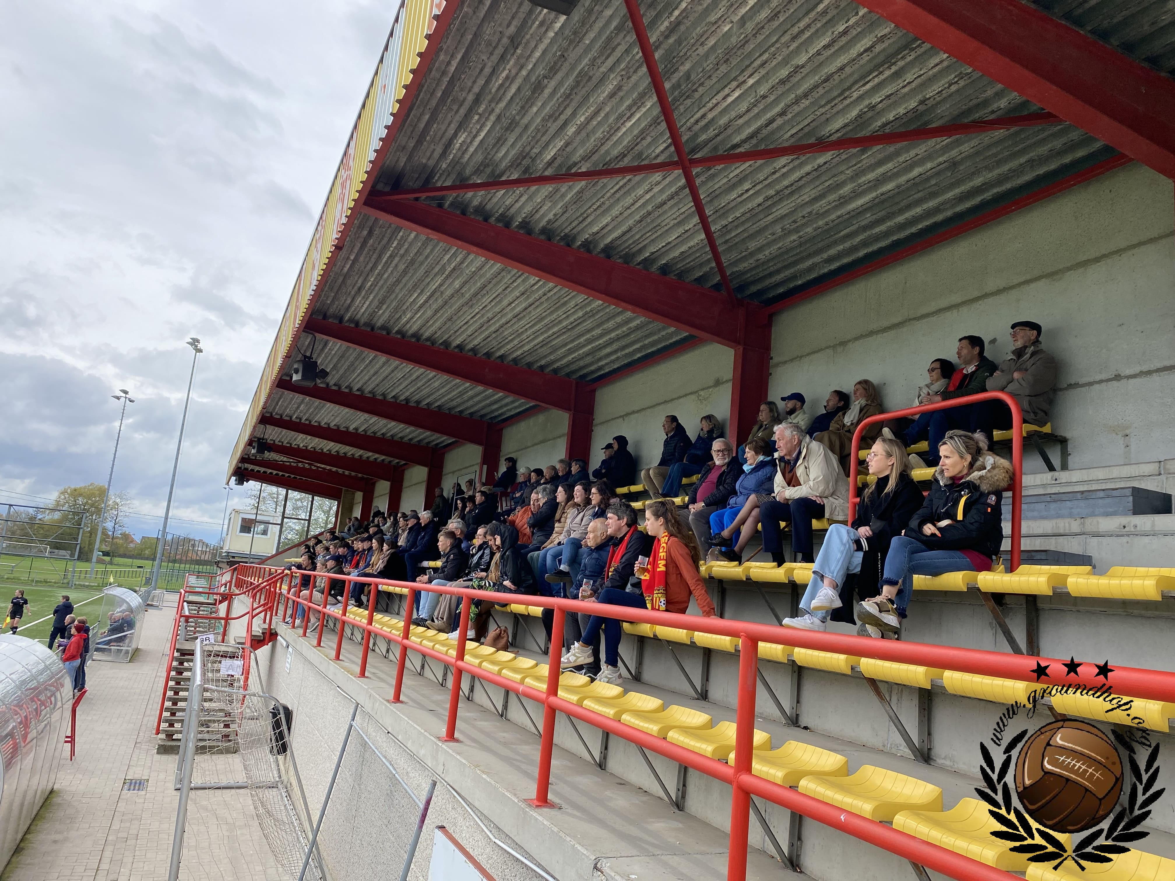 Inmiddels posteren wij onszelf aan de andere kant van het veld, zodat we zekerheid hebben dat we alles van het Mirakelstadion goed op de foto hebben staan. Nadat we dit eenmaal hebben afgerond lopen we weer terug naar iets overdekts en terwijl wij dit doen valt het langverwachte eerste doelpunt. Het is een voorzet die van dichtbij wordt binnengekopt waarop de doelman van Waregem moet capituleren en zo staat Diksmuide op voorsprong.