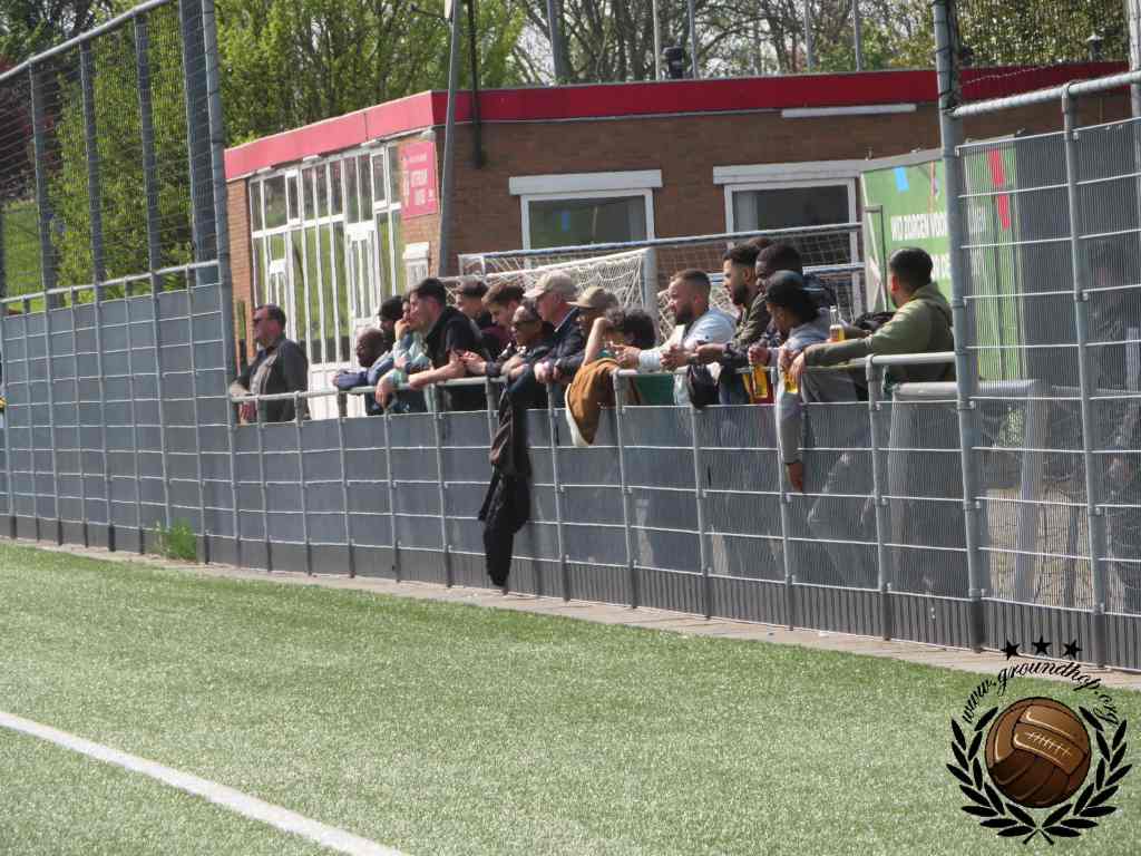 Ondanks deze rammer van een derby, zijn wij vandaag verantwoordelijk voor ongeveer 10% van de opkomst. We halen een biertje in de kantine, maar het blijkt dat de tap buiten werking is. Gelukkig krijgen we gewoon een heerlijk koud blikje mee, welke zonder restricties mee mag naar de zijlijn. Of er in de Vierde Klasse ook gestaakt zou moeten worden wanneer er wat op het veld gesmeten wordt weten we niet zeker, dus we houden het blikje netjes in de hand.