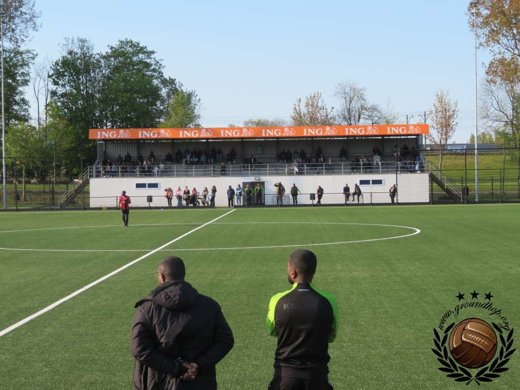 In het tweede bedrijf nemen wij plaats om de lange zijde, want ook hier staat een leuke tribune welke we graag eens goed op de foto zetten. Nog steeds schijnt het lentezonnetje op onze kar dus maakt het ons het niet zo veel uit wat er ons wordt voorgeschoteld, maar ook de tweede helft bevat nog het nodige vuurwerk. Na een zeer tam begin van deze helft blijkt al het venijn hem in de staart te zitten. Maense probeert met tien man het enigszins in slaap gesuste LMO nog te laten wankelen, maar echt grote kansen zitten er niet in.