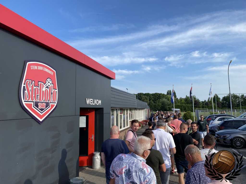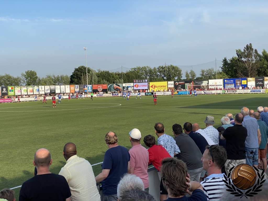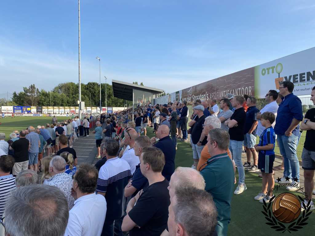 Al vooraf wordt er opgeroepen om zo vroeg mogelijk richting het sportpark te komen, want het terrein kan de loop van het aantal verwachte aanwezigen waarschijnlijk niet aan. Dat blijkt al snel, want zo’n half uur voor de aftrap worden we al gedwongen om onze Ferrari neer te zetten op een achterveldje wat voor de gelegenheid maar is omgedoopt tot parkeerplaats. Ook voor de kassa staan flinke rijen, al hebben we het geluk dat we de echte meute voor zijn. Eenmaal binnen begint de volgende uitdaging, want een biertje bemachtigen is met deze drukte ook geen gemakkelijke opgave. We halen het proviand voor heel de wedstrijd maar in één keer want dat is lekker efficiënt. Bijna komen we zeer bedrogen uit want we staan nog geen minuut en we krijgen al een bal op ons afgeschoten. Gelukkig raakt het ons bier niet en komen we alles zonder kleerscheuren door.