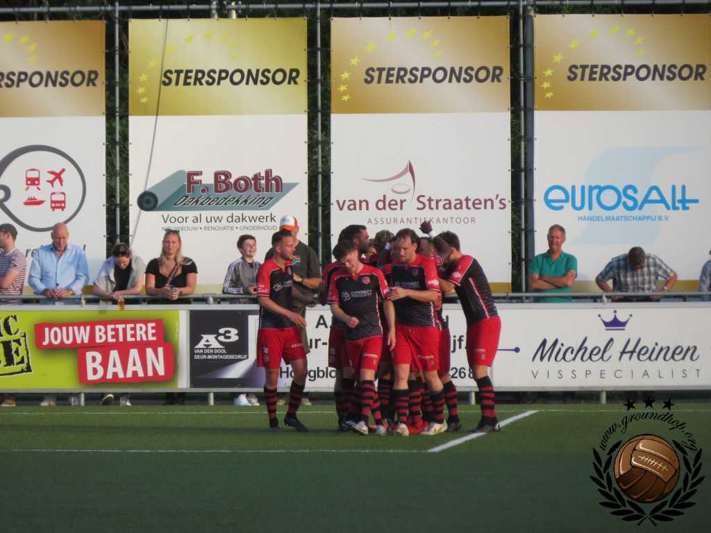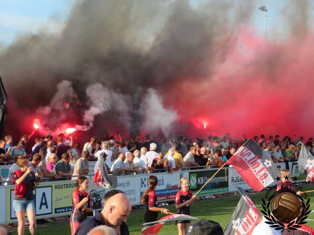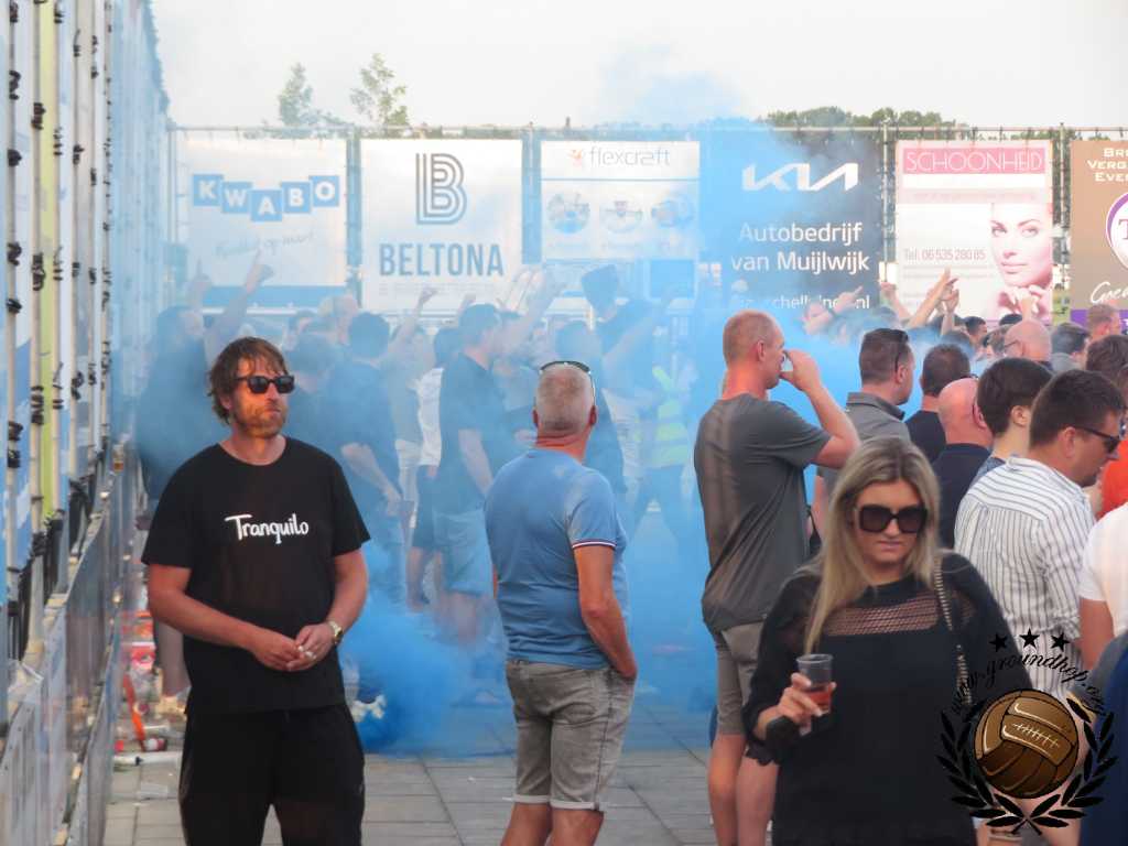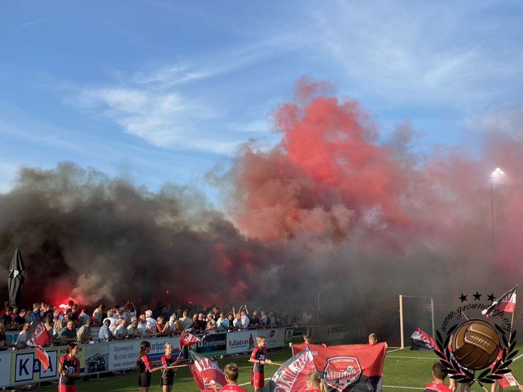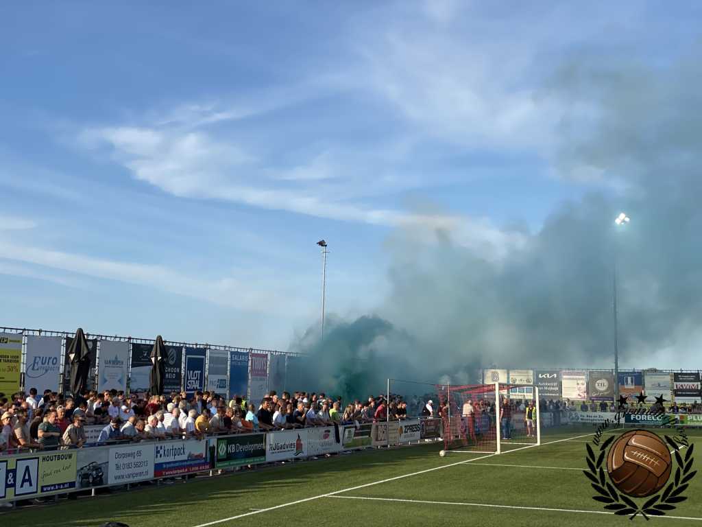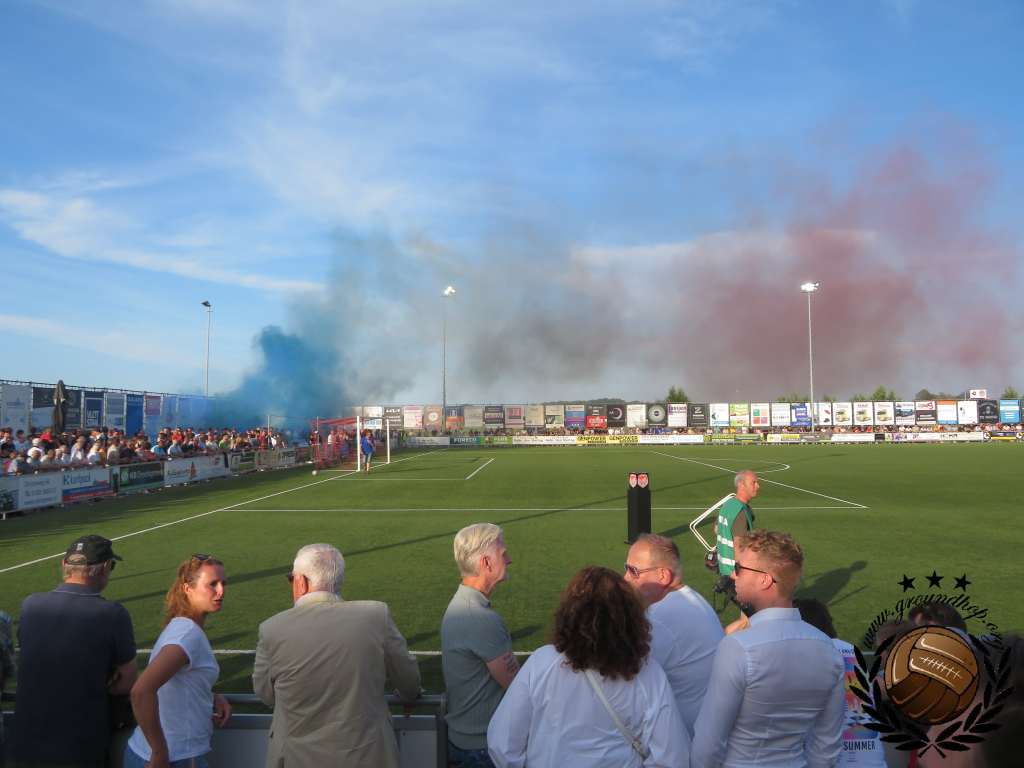 Al snel komen we tot de conclusie dat we precies tussen de sfeeracties van beide kampen in staan en nog voor de aftrap zoeken wij ons heil op een andere tribune. Vanaf deze andere plek is het op de foto zetten van deze sfeeracties een stuk beter te doen. Eerst begint SteDoCo met de nodige rookpotten en fakkels en nadat deze dampen zijn neergedaald is het de beurt aan GVVV die met een soortgelijke actie komt, maar dan in een andere kleur. De sfeeracties zijn gelijkend aan elkaar, de verhoudingen op het veld zijn dat absoluut niet. De blauwen uit Veenendaal grijpen de thuisploeg meteen bij de strot en ze mogen de keeper dankbaar zijn dat het niet in de eerste minuten van de wedstrijd al tegen een achterstand aankijkt. Zoals wel vaker tegenwoordig, duurt dit tot ongeveer de drinkpauze. Wederom wordt dit moment aangegrepen voor de nodige tactische wijzigingen en zo biedt SteDoCo in het tweede deel van het eerste bedrijf opeens keurig weerstand. Sterker nog, vlak voor rust komen ze op voorsprong, want Joran Schröder heeft het vizier wel op scherp zijn in tegenstelling tot iedereen van GVVV.