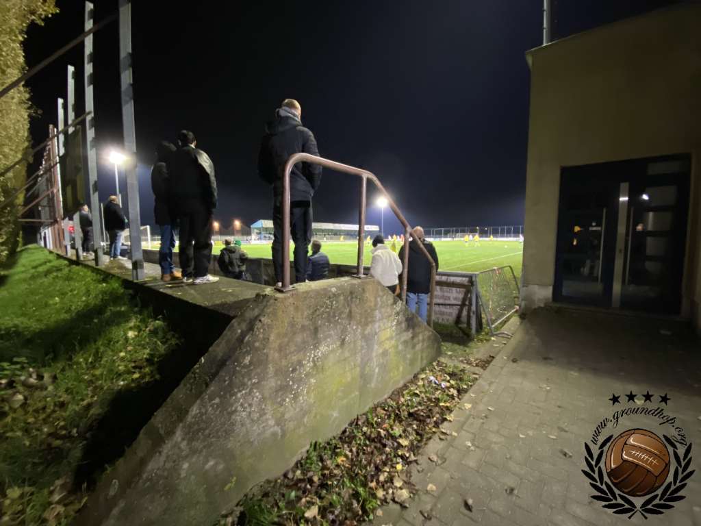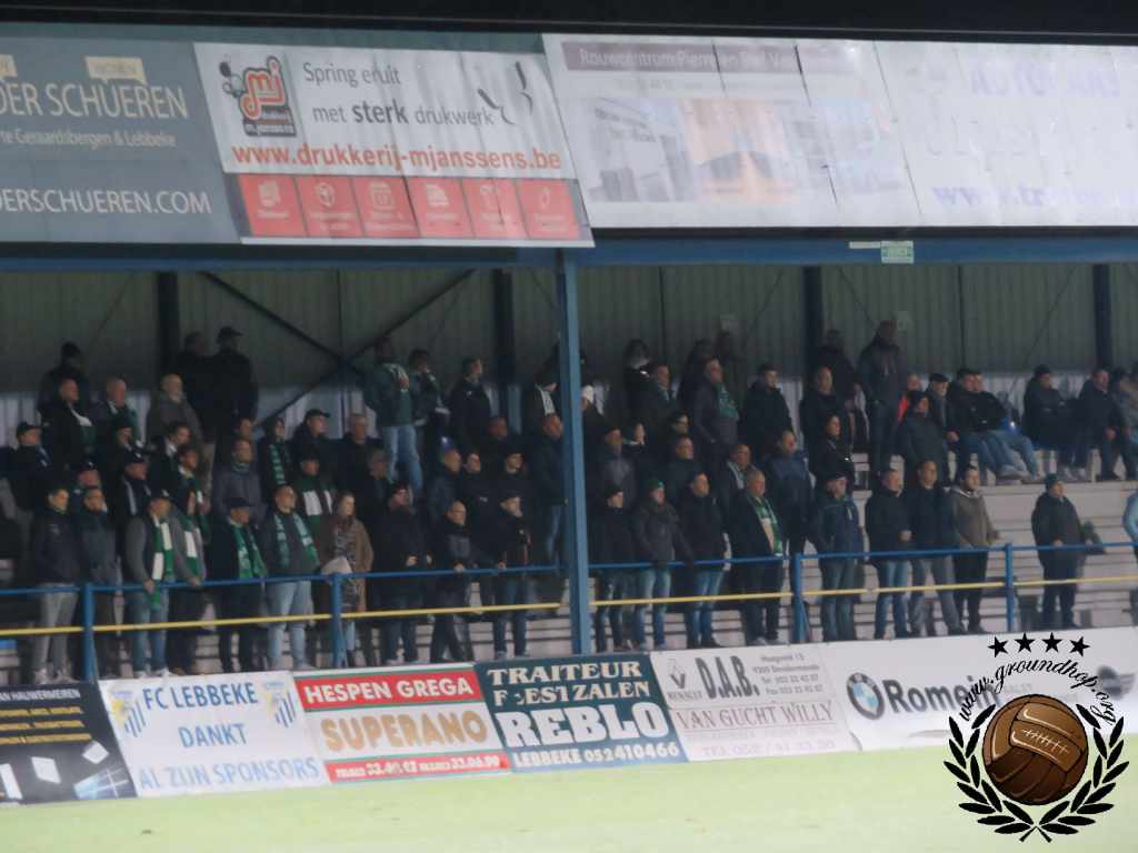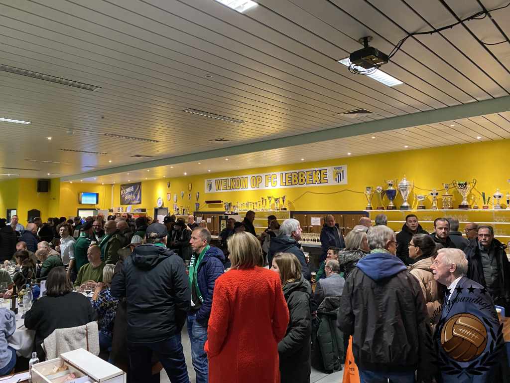 Het is vandaag koud en vooral regenachtig. Even vrezen we nog voor uitstel van deze wedstrijd, maar Lebbeke blijkt niet in de penibele zone van mogelijke overstromingen te liggen. Wel was het uitstellen van deze wedstrijd niet ver weg als we zien hoeveel water er nog op en rond het veld ligt, maar gelukkig komen we hier pas achter op het moment dat de spelers al op het veld staan. Voordat de wedstrijd begint halen we nog een drankje (met van die achterlijke jetons) en een hamburger zodat we met onze buikjes gevuld aan de wedstrijd kunnen beginnen.