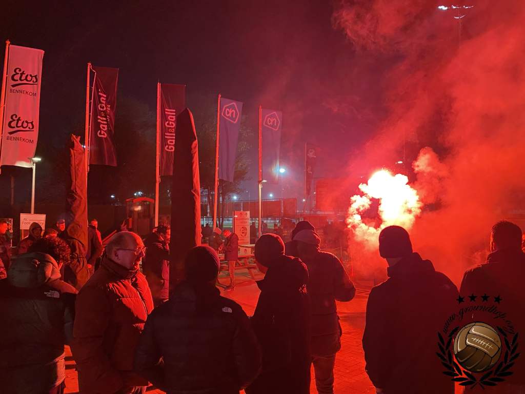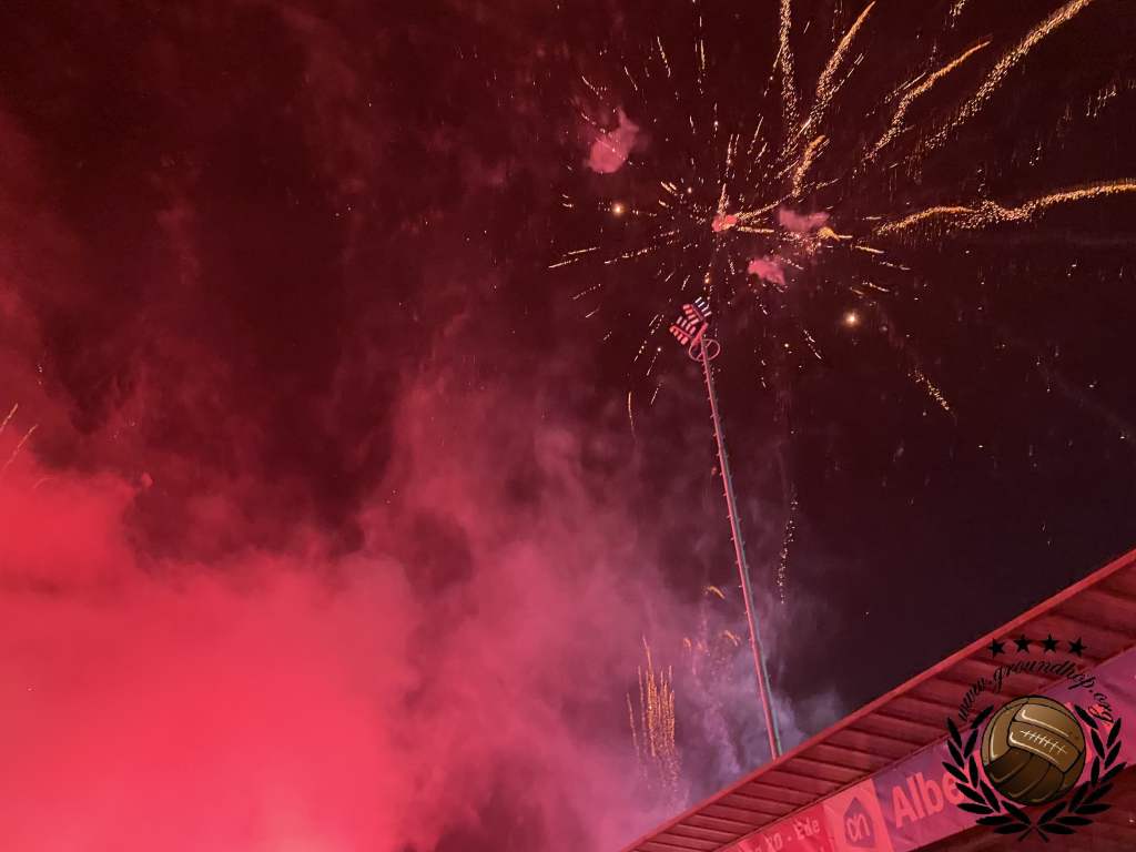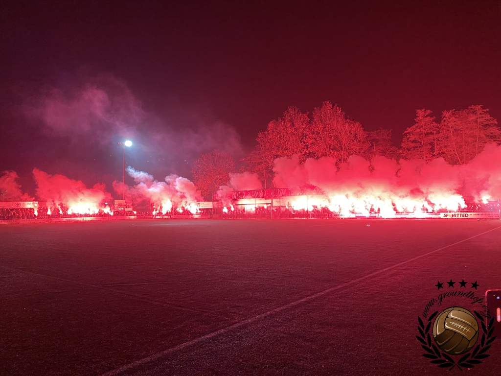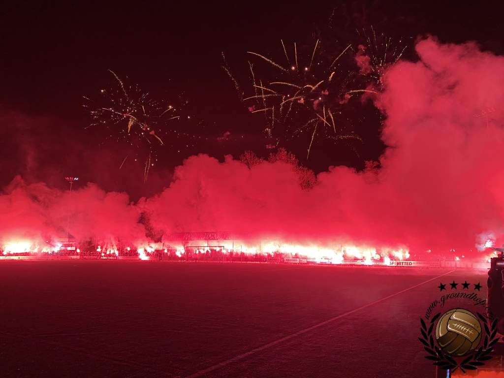 Een kwartiertje later dan verwacht, maar dan gaan we toch eindelijk beginnen. De spelers komen het veld op, de lichten van het sportpark gaan uit en dan weten wij al hoe laat het is. We pakken de camera’s erbij en zijn er als de kippen bij om een paar leuke plaatjes te schieten van de duidelijk georganiseerde pyro-actie. Ongetwijfeld is dit één van de betere die we dit jaar gaan zien en als je dan bedenkt dat dit geregeld is door een amateurclub kunnen wij alleen maar een diepe buiging maken. Aan de zijde van de gasten gebeurt er niets, daar twijfelen wij zelfs lang over of ze vandaag wel aanwezig zijn.