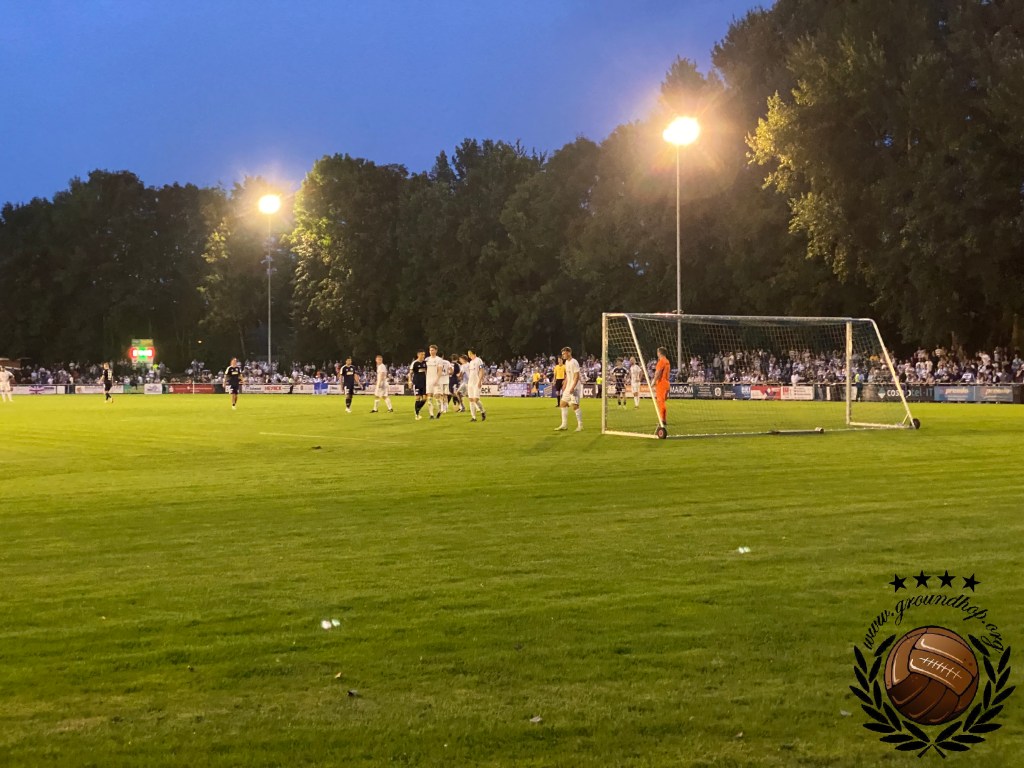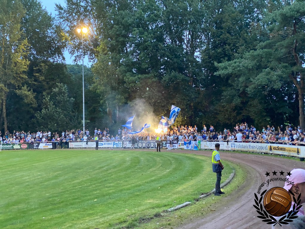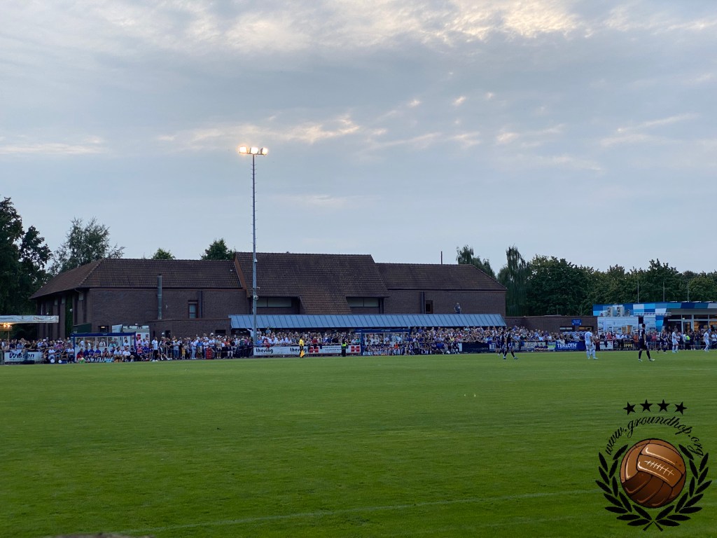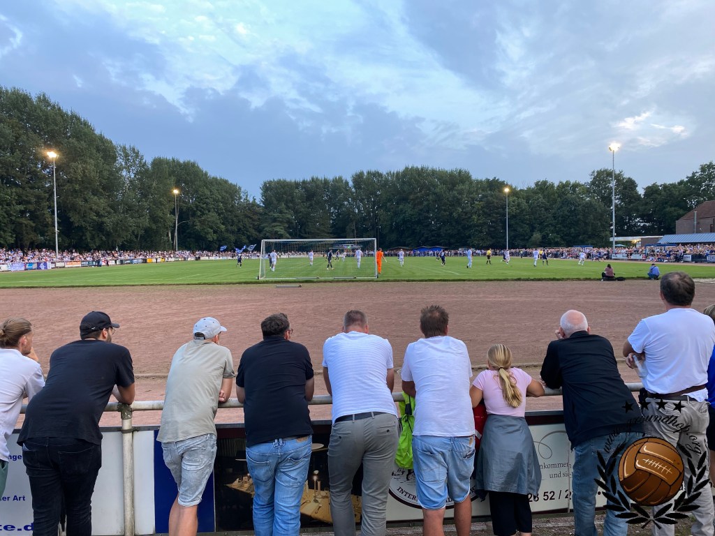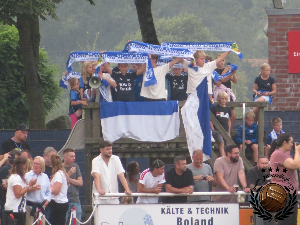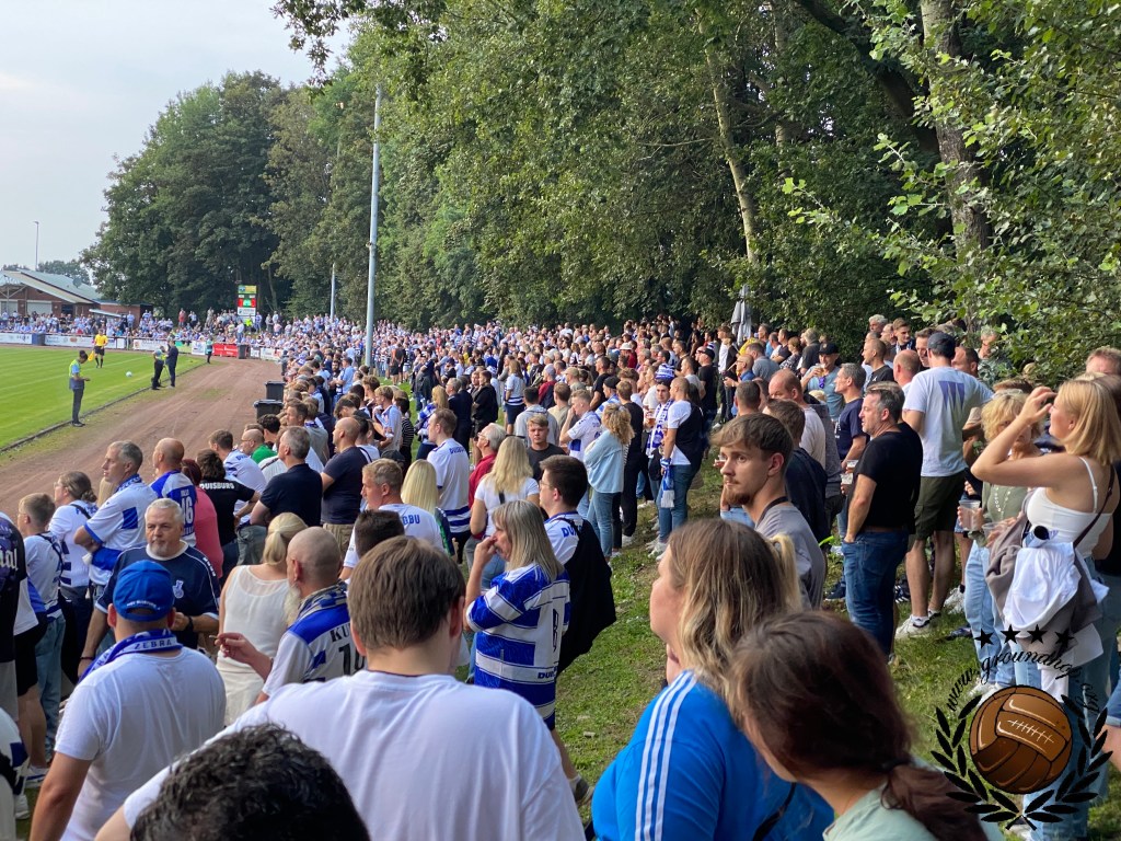 Op het terrein van Dingden, dat niet meer is dan een veld met clubgebouw is het inderdaad lekker druk. Het overgrote deel is uiteraard afkomstig uit Duisburg. Op het veld lijkt het ook een walk in de parc te worden voor Duisburg, als de bal al na iets meer dan een minuut in het netje ligt. Deze goal wordt echter afgekeurd en vervolgens krijgen we een hele stroperige eerste helft, waarin Duisburg niks klaarspeelt en Dingden goed stand weet te houden. Het is echter met het allerlaatste balcontact van de eerste helft waarmee Duisburg toch de voorsprong weet te pakken. De goal hoeft niet eens gevierd te worden, want ze kunnen direct door de kleedkamer in.