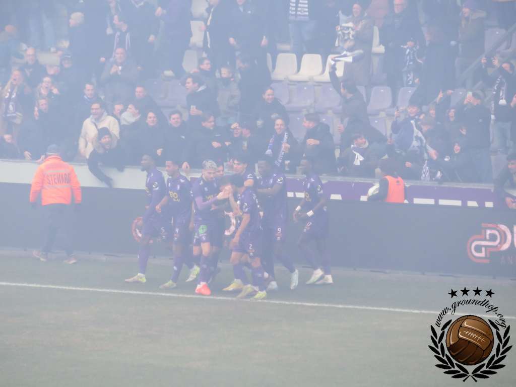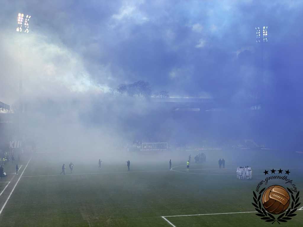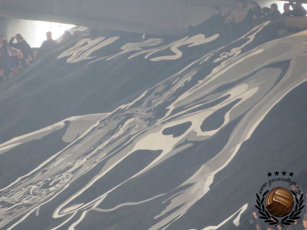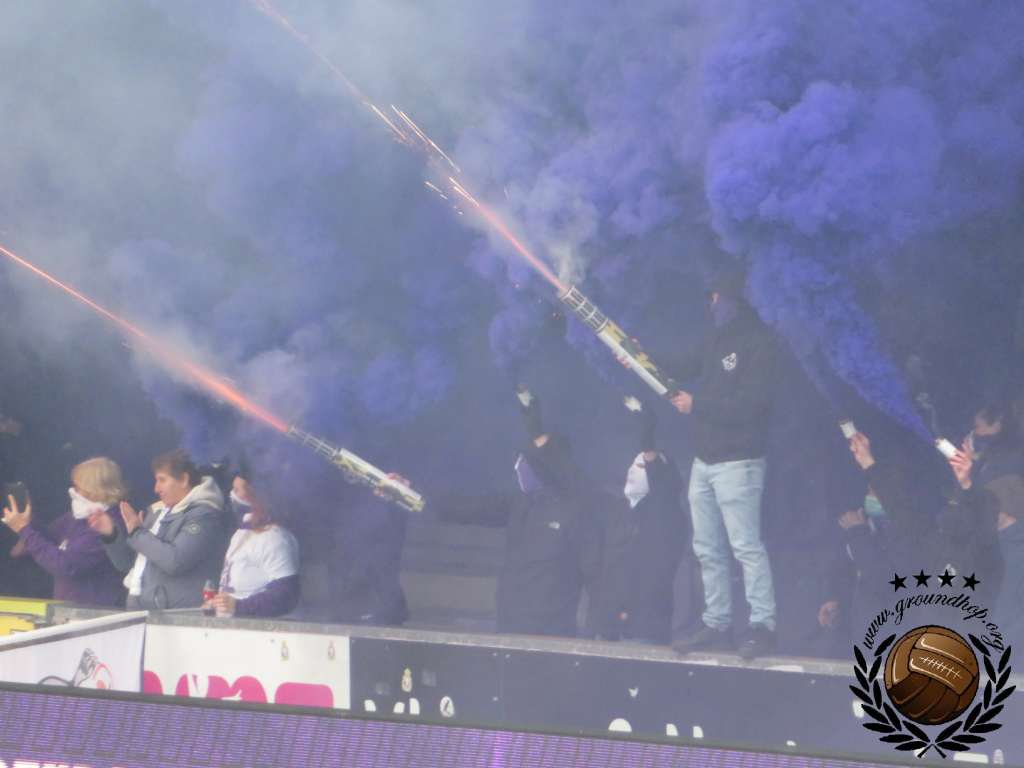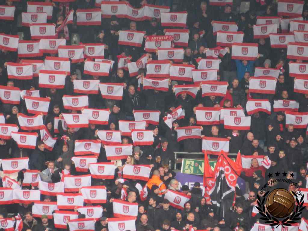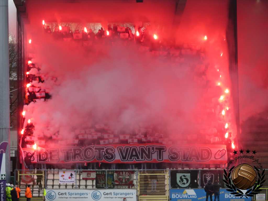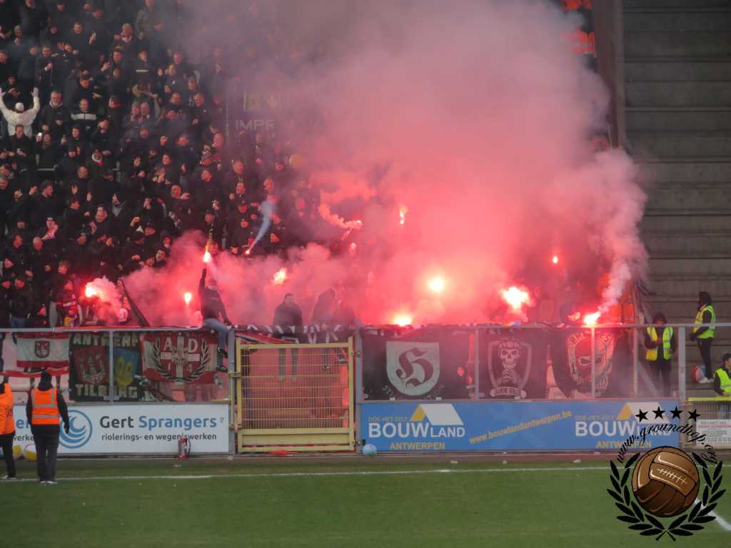 De aanhang van Antwerp komt met een vak vol Antwerpse vlaggen en doek met “trots van ’t stad.” Aan de rand van het vak worden fakkels afgestoken.