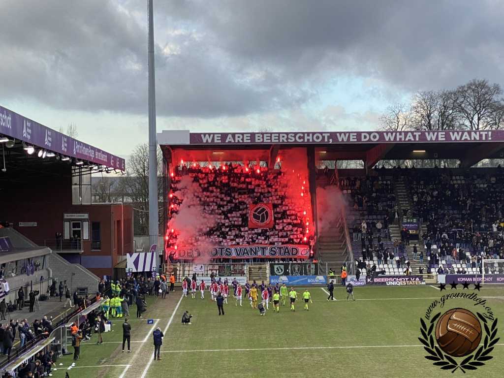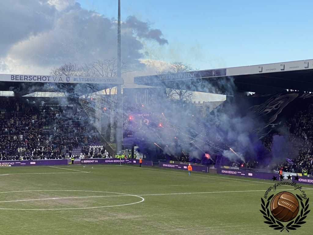 De derby begint zoals een derby hoort te beginnen. Beide supportersgroepen pakken flink uit met sfeeracties. Te beginnen met Vak I van Beerschot. Daar verschijnt een groot doek met een spook die de Antwerpse Dom vasthoudt. Vanaf de onderkant wordt het paars-wit omlijst met rookpotten, fakkels en shooters.