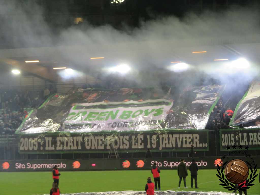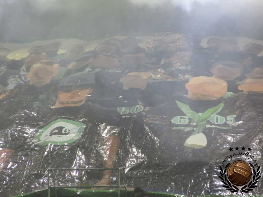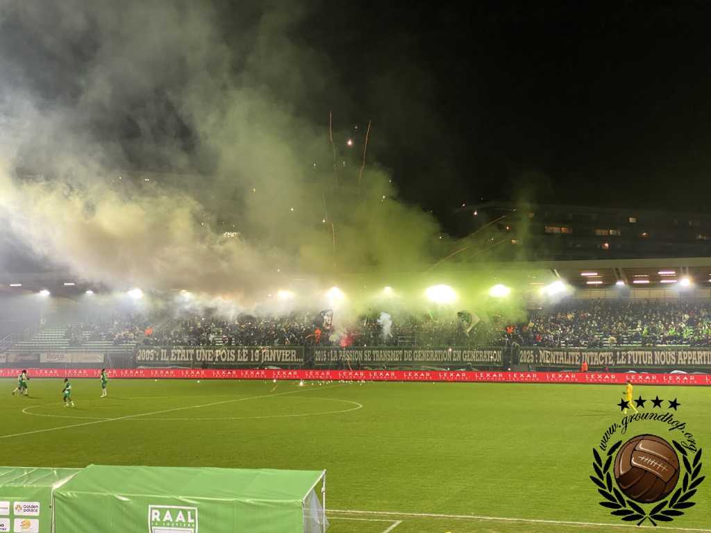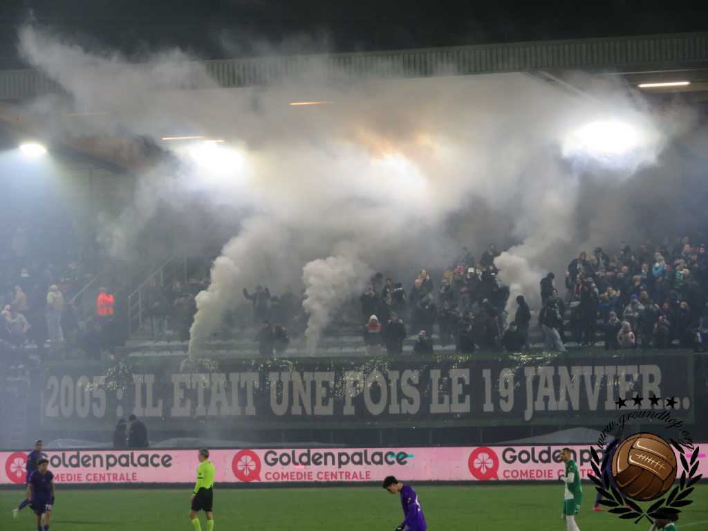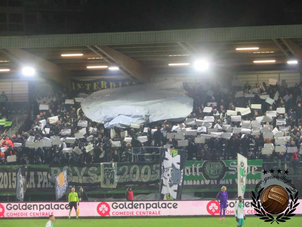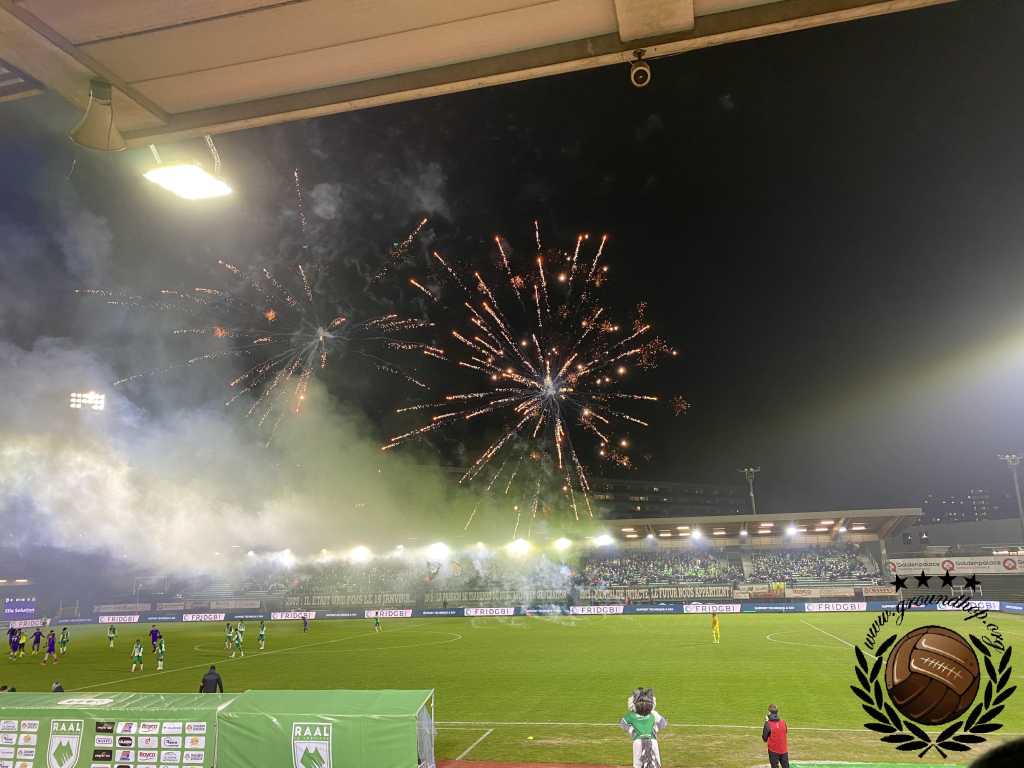 Vol goede moed trotseren we dan ook de winterse vrieskou voor een afscheid van Tivoli en een hele hoop vuurwerk. De wedstrijd van vandaag is tegen de RSCA Futures, dus daar hoeven we het niet voor te doen. Gelukkig hoeven we niet lang op de vuurwerkshow te wachten. Bij opkomst toont Green Boys een drie delige tifo die het ontstaan, 10 jarig bestaan en 20 jarig bestaan van de groep toont. Zodra de doeken verdwijnen komt – zoals verwacht – het vuurwerk te voorschijn. Eerst alleen rook en fakkels, wat de scheidsrechter nog accepteert. Even later gaan er ook shells de lucht in en dan is de scheids er klaar mee. Na een kleine minuut spelen ligt het spel alweer stil.