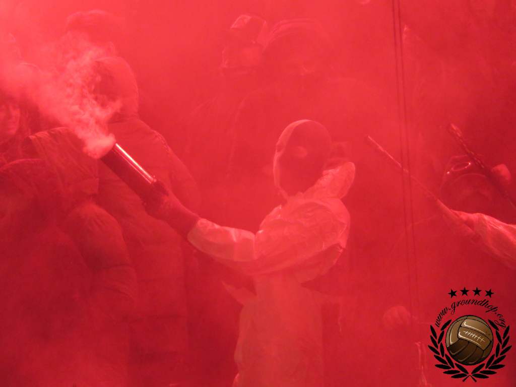 De opkomst wordt door de Bossche aanhang omlijst met een fraai doek ter ere van dit 5-jarig bestaan. Zodra het doek naar beneden is zien we de eerste wit-blauwe bivakmutsjes al tevoorschijn komen, dus weten we hoe laat het is. Er volgt een spectaculaire pyroshow met fakkels, shooters en rookpotten.