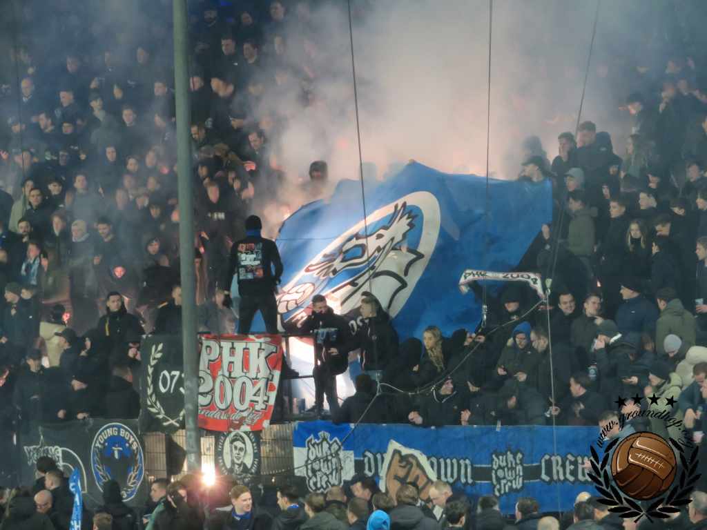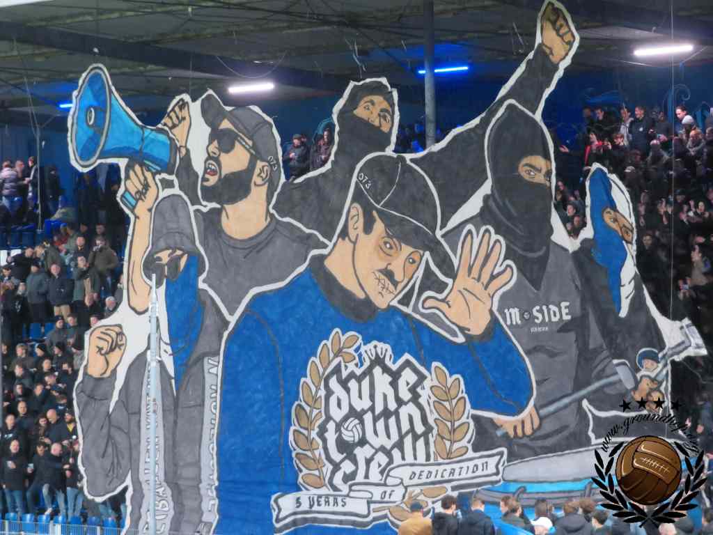 Een zeer sfeervolle Vliert is vandaag het toneel van de derby tussen FC Den Bosch en TOP Oss. Helaas wederom zonder uitsupporters, maar dat is bij Nederlandse derby’s tegenwoordig meer regel dan uitzondering. Er is wel reden voor een feestje, want Duketown Crew bestaat vandaag 5 jaar. Na het 20-jarig bestaan van Green Boys vorige week, pakken we dus wederom een verjaardag mee.