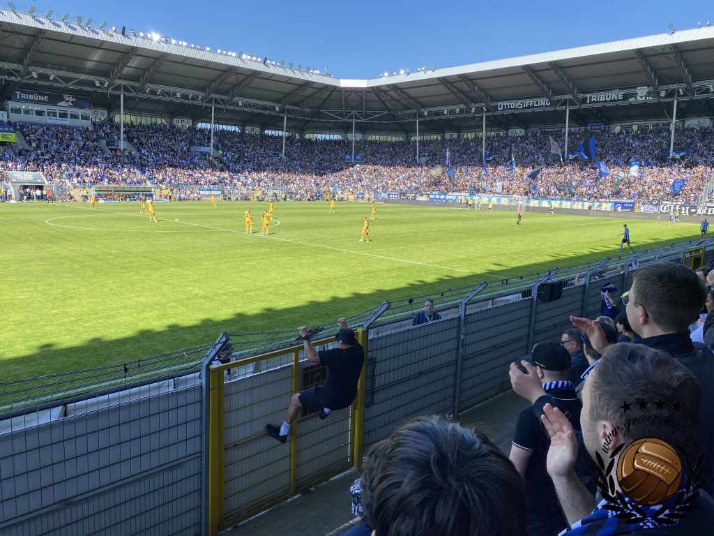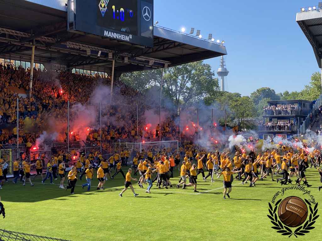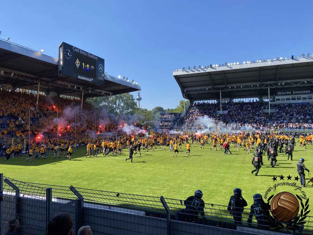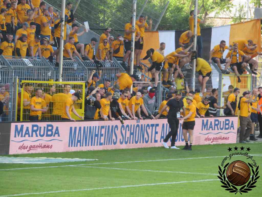 De grote belangen zorgen voor een vol stadion vandaag in Mannheim. Dresden heeft ruim 3.500 supporters mee en is daarmee vocaal in ieder geval de baas in het Carl-Benz-Stadion. Toch laten ook de ultras van Mannheim zich goed horen en zorgen ook voor een prima sfeer. Wat wellicht meehelpt is dat Waldhoff, tegen de verwachtingen in, op voorsprong komt tegen de nummer twee van de ranglijst. Na vorige week de winst tegen nummer vier, Cottbus, is de thuisploeg aan een heuse Houdini-act bezig voor lijfsbehoud. Toch wordt er ook aan Dresdener zijde gefeest, want het wordt al snel duidelijk dat concurrent Saarbrücken gaat verliezen. Hierdoor doet de wedstrijd hier er niet meer toe en is Dresden zeker van promotie.