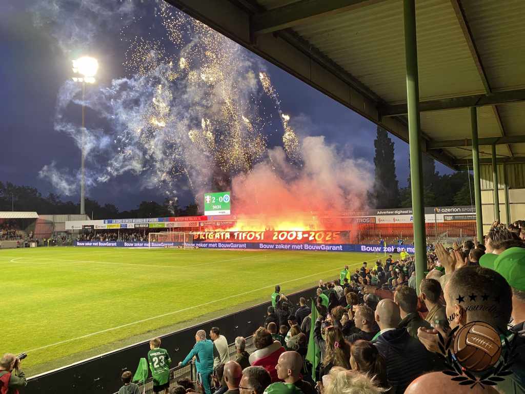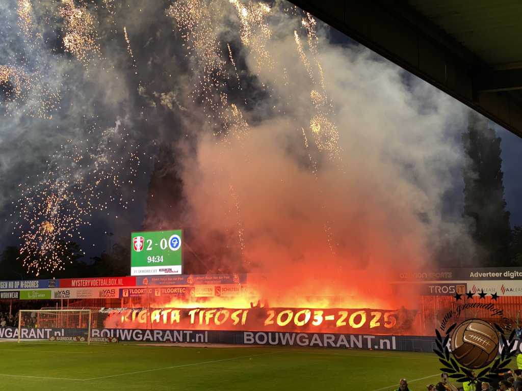 Vlak voor de 90e minuut wordt het doek uitgerold. ‘Brigata Tifosi 2002-2025′ valt er te lezen op het geheel zwarte doek. In de blessuretijd komt er vanacht dat doek een flinke portie vuurwerk tevoorschijn. Fakkels en strobo’s verlichten de letters van het doek, terwijl er vanop het hek een flinke hoeveelheid vuurwerk de lucht in wordt geschoten. Het is een afscheidsactie die BT-waardig is. Ook vanaf de Dordtse tribunes wordt deze met applaus begeleidt. Het afscheid van Brigata Tifosi is een enorm verlies voor de Nederlandse supportersscene.