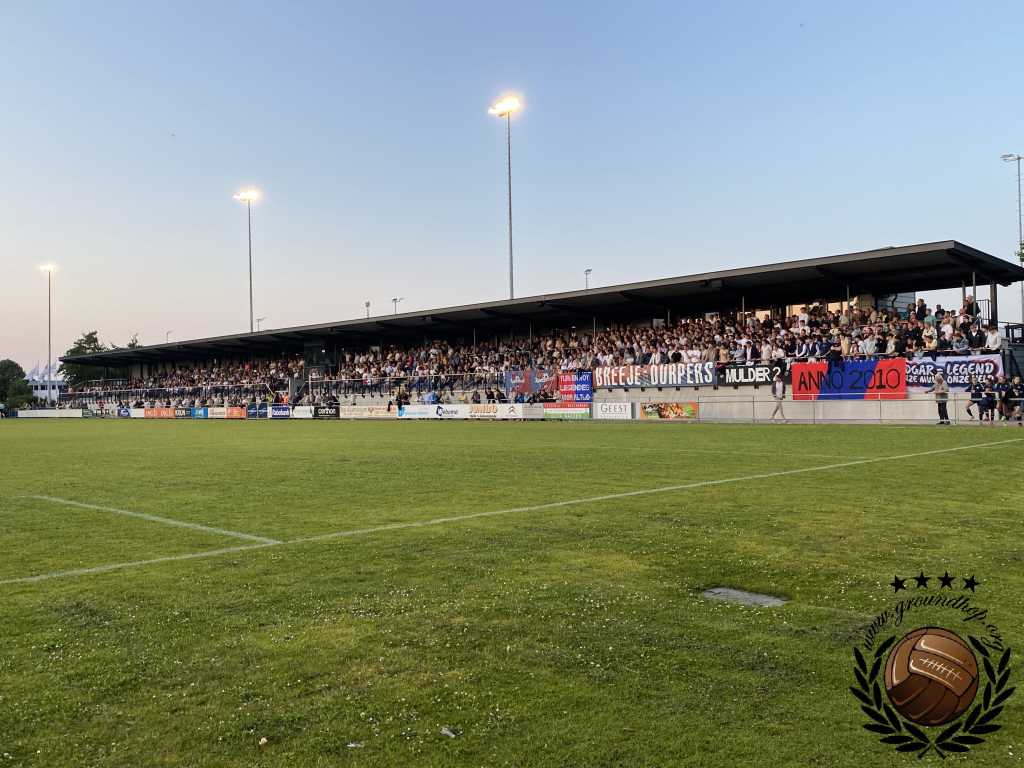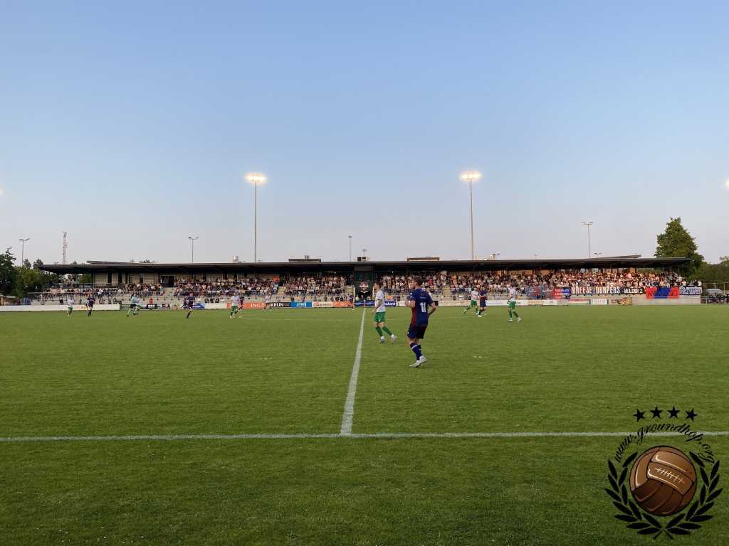 De hoofdtribune van Sportpark Juliana zit ramvol en is uitermate sfeervol. Helaas geen vuurwerk bij de opkomst, maar dat mag de pret niet helemaal drukken. Het zonnetje schijnt, er is bier, er wordt gevoetbald: dit is een prima seizoensafsluiter.